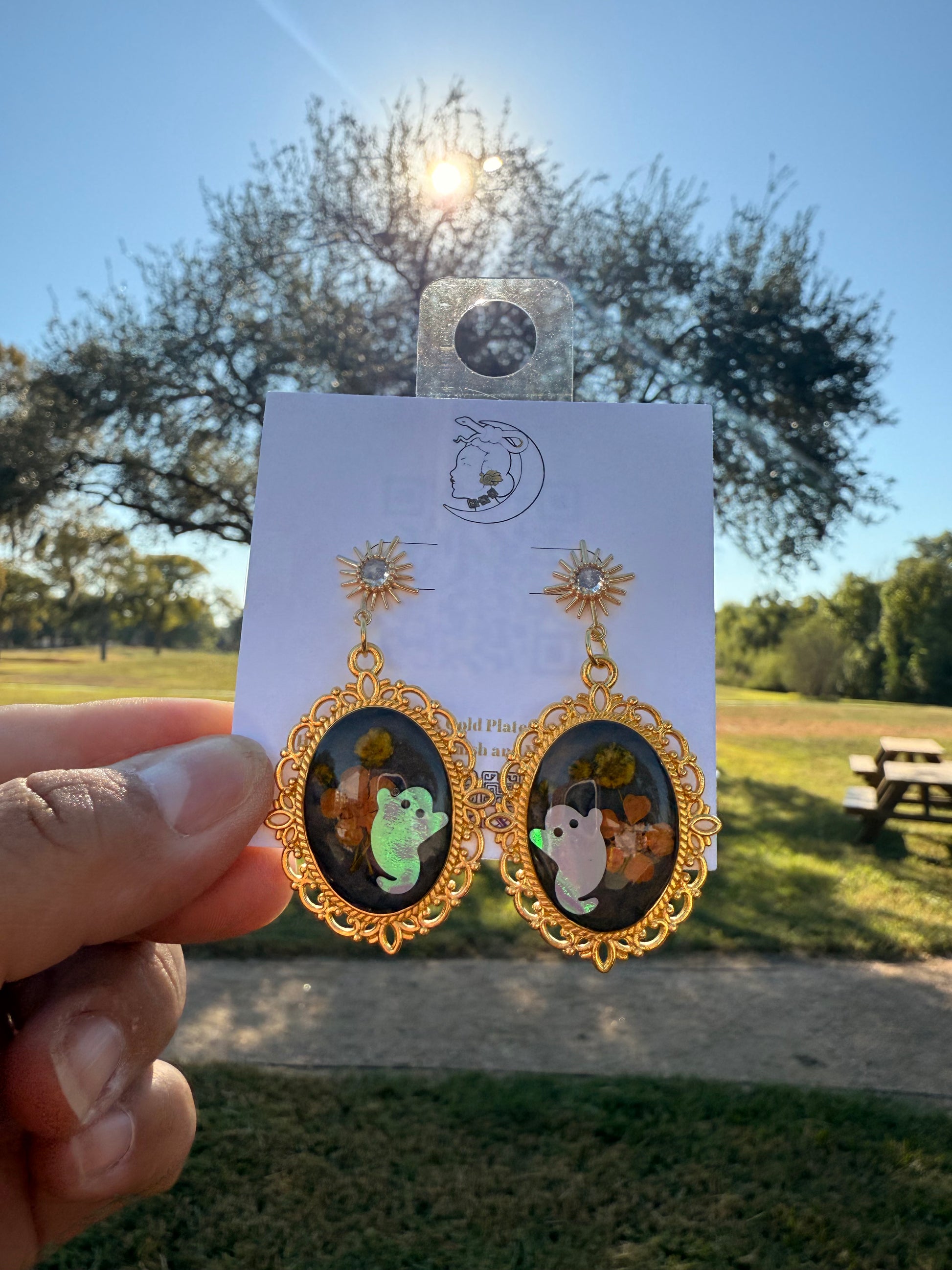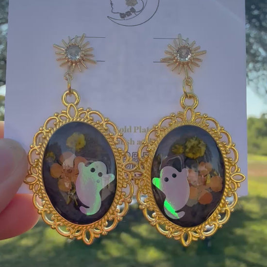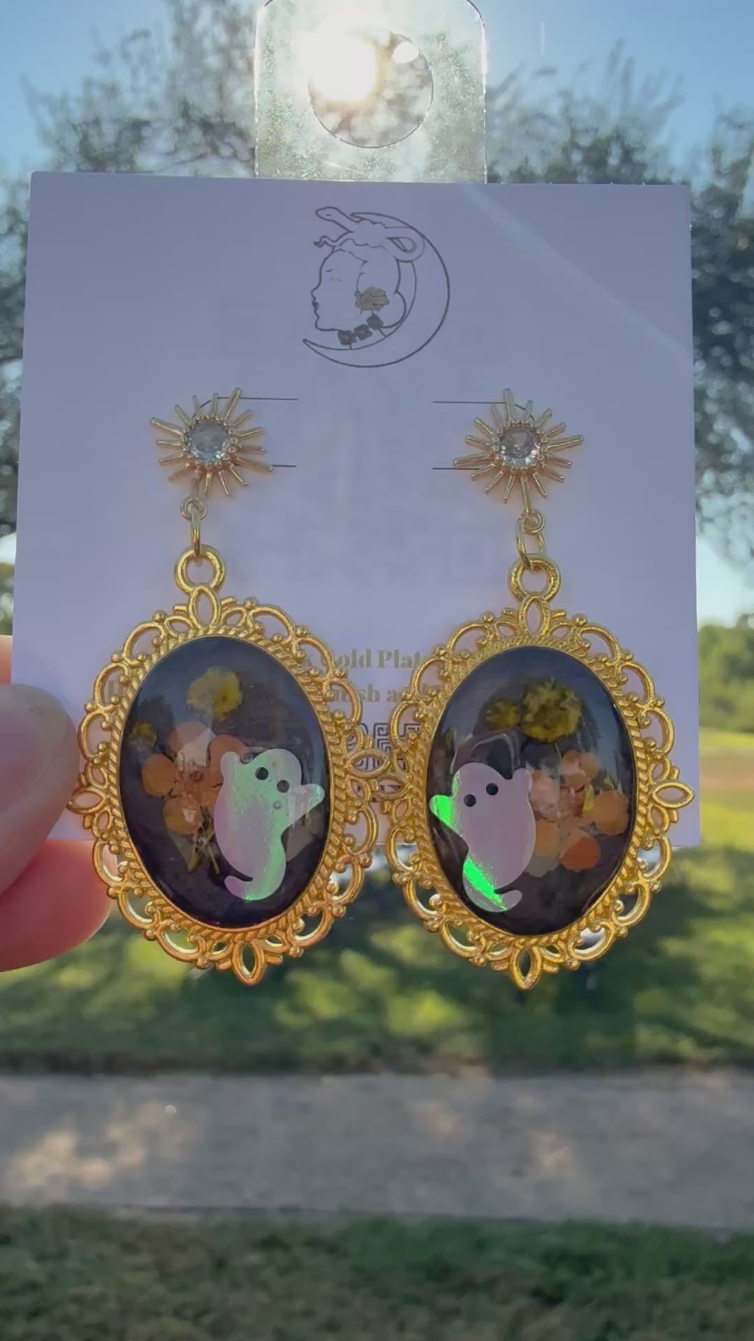 -Light weight handmade earrings. Natural dried flowers and a little cute ghost 👻. 14k gold plated post.